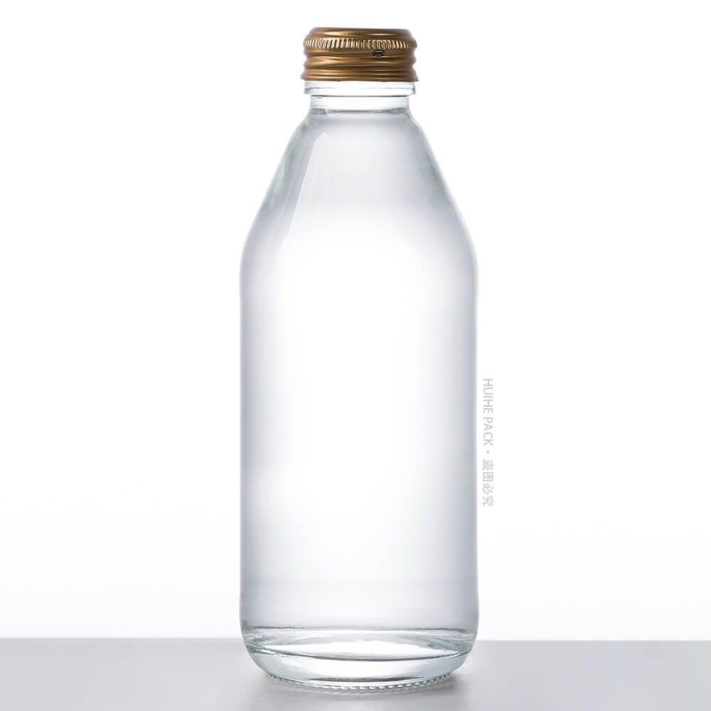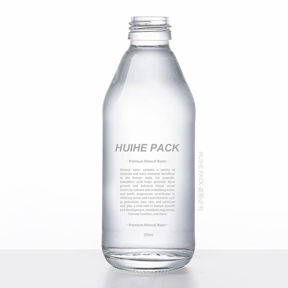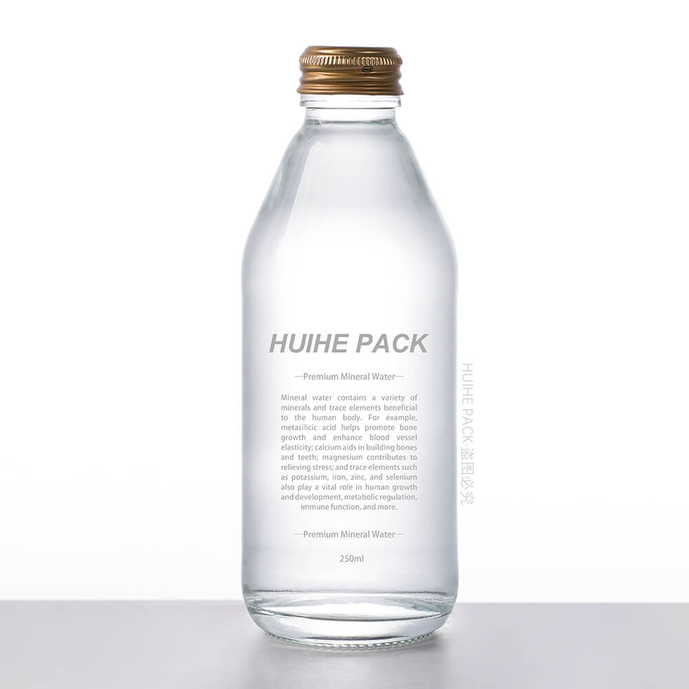 This 250ml glass water bottle has a clean, streamlined cylindrical shape: it stands 158mm tall with a 58.3mm base diameter, featuring smooth, straight sides and crystal-clear glass that gives a sleek, modern look—perfect for high-end mineral water brands aiming for a minimalist, premium package.