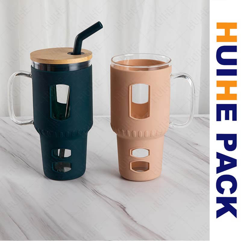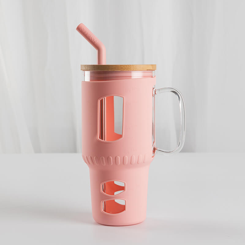 This 32oz borosilicate glass water cup features a sturdy, cylindrical shape with a built-in side handle that offers a comfortable grip for easy holding. It comes in soft, matte-colored silicone sleeves (including pink, white, dark green and light brown) that add a stylish touch while fitting snugly around the glass. The clear glass body inside the sleeve lets users see the content level clearly.