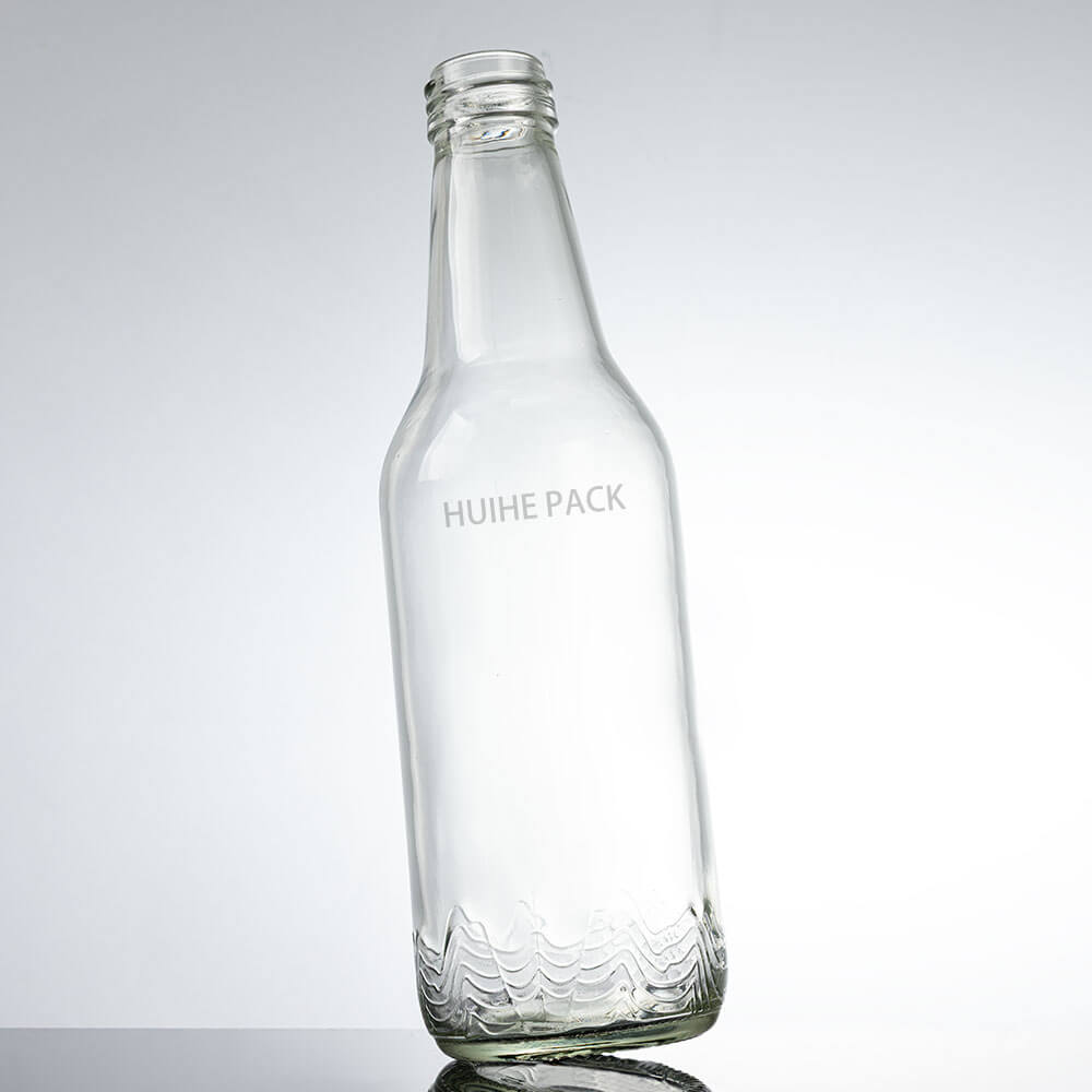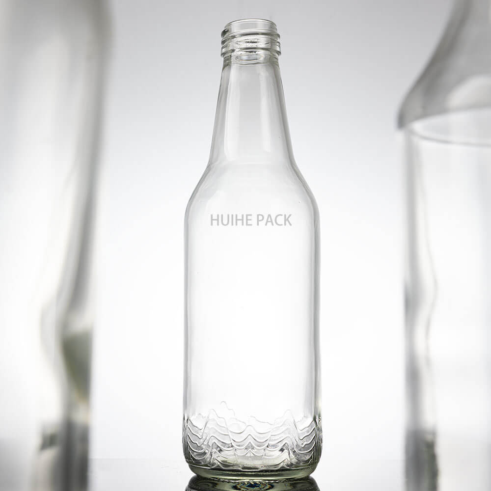 This premium glass water bottle holds 380ml, standing 202mm tall with a 59mm body width. It features a sleek, tapered shape: a narrow threaded neck widens gently into a slender body, finished with a textured wave pattern at the base that adds subtle visual appeal. Its clear, high-transparency glass showcases contents vividly, making it ideal for high-end mineral water brands and premium beverages.