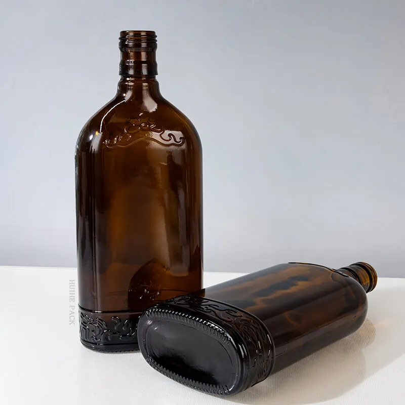 This amber glass beer bottle boasts a classic yet distinctive silhouette. It has a rounded, robust body that tapers gently into a short neck, designed for easy capping and pouring. The bottle’s surface features elegant embossed patterns—ornate designs at the shoulder and base—that add a touch of vintage sophistication. The warm amber hue not only protects the beer from harmful light but also gives the bottle a premium, timeless look, perfect for craft breweries aiming to stand out on shelves.