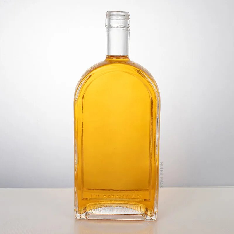 Our glass liquor bottles showcase a unique and sophisticated design. The body of the bottle features a rectangular base with gently curved top edges, creating an arch - like silhouette that stands out on the shelf. The smooth, transparent glass surface enhances the visual appeal, allowing the rich color of the liquor inside to be clearly visible.