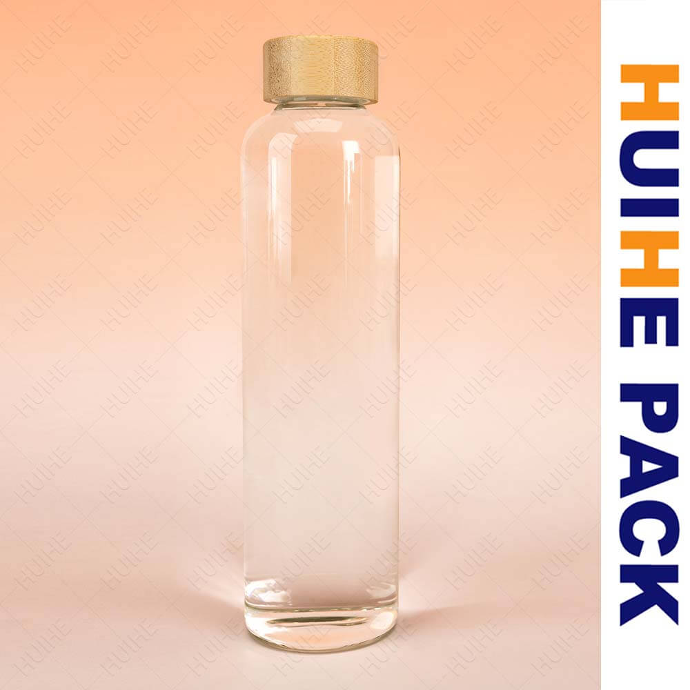 This borosilicate glass water bottle comes in two sizes, featuring a sleek, elongated cylindrical shape with smooth, rounded edges and a clear, transparent body that showcases beverage contents clearly. It pairs with a natural bamboo cap that adds a warm, eco-friendly touch, creating a cohesive and minimalist look suitable for daily use or on-the-go hydration.