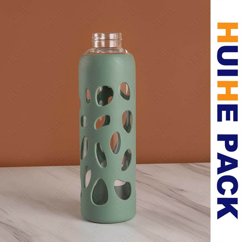 This borosilicate glass water bottle features a sleek, elongated cylindrical shape, paired with diverse decorative designs: one style has a colorful marbled glass finish that adds a artistic touch, while others are wrapped in silicone sleeves with unique cutout patterns that reveal the clear glass beneath. These designs blend visual appeal with practicality, making the bottle stand out in daily use.