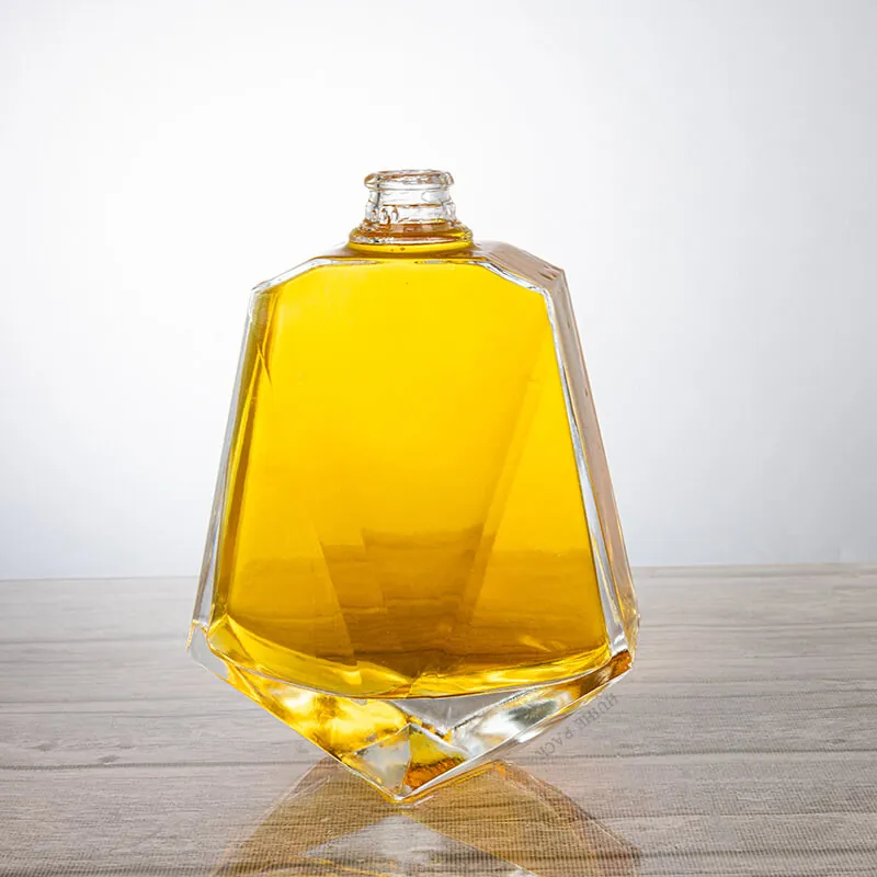Crafted from high - quality glass, this bottle exemplifies top - notch manufacturing standards. The clarity of the glass allows the rich color of the liquor inside to be prominently displayed, while the thickness ensures durability. Each facet is precisely cut and polished, demonstrating meticulous craftsmanship. The neck is expertly formed to fit stoppers securely, safeguarding the integrity of your spirits. When you choose this bottle, you're investing in "high - end glass liquor bottles" that combine aesthetic appeal with reliability.