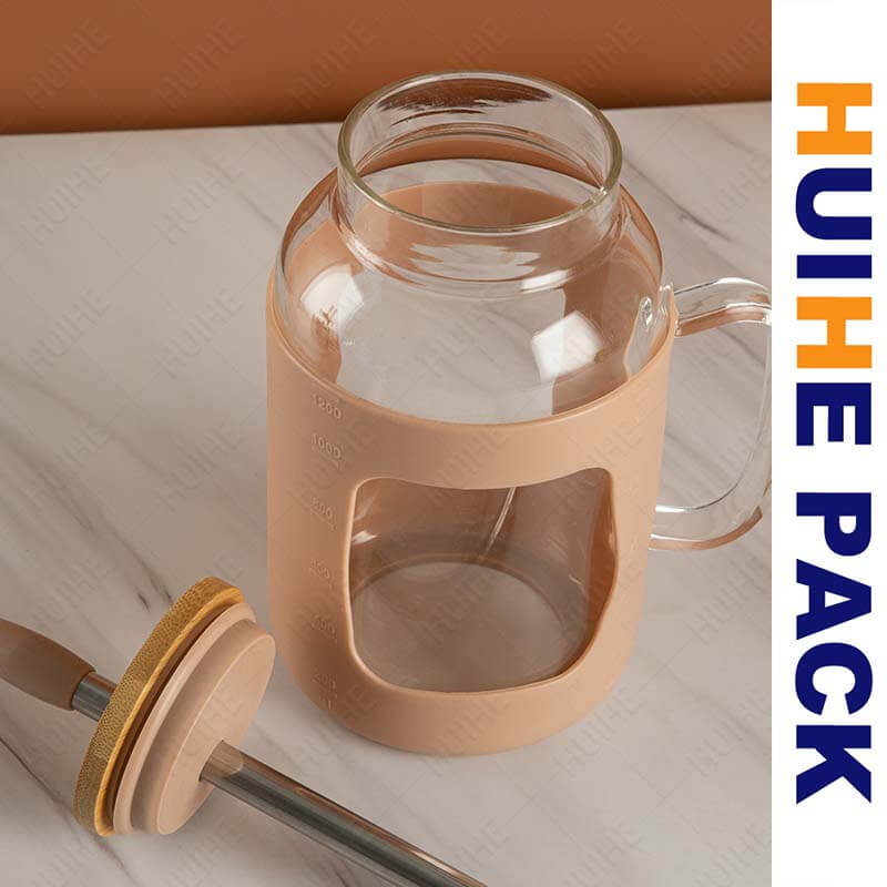 This large-capacity borosilicate glass water bottle features a sturdy, cylindrical shape with a built-in side handle for easy gripping. It’s wrapped in a soft, matte silicone sleeve that fits snugly around the clear glass body—revealing the content level through a cutout window, while adding a sleek, modern touch. The wide neck simplifies filling and cleaning, making it ideal for iced water, infused drinks, or other beverages.