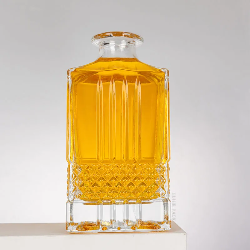 Crafted with meticulous attention to detail, this bottle is made from high - quality glass that offers both durability and clarity. The embossed patterns are expertly formed, with each line and facet precisely cut to create a stunning visual effect. The thickness of the glass is carefully calibrated to ensure sturdiness while maintaining an elegant appearance. The neck is precisely engineered to fit stoppers securely, safeguarding the integrity of your spirits. When you choose this bottle, you're investing in "high - end glass liquor bottles" that combine beauty and functionality.