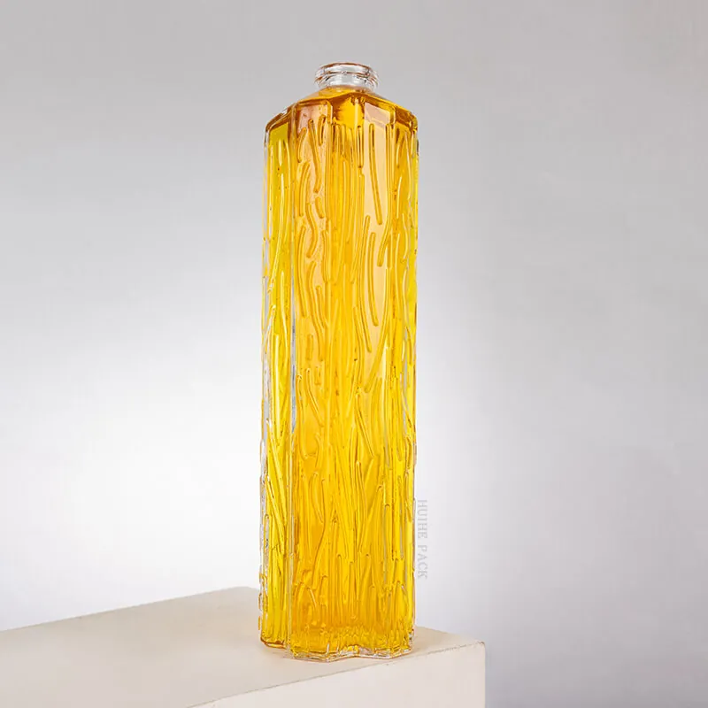 The top of the bottle features a short, cylindrical neck that seamlessly connects to the body. The edges of the bottle are slightly angled, giving it a faceted appearance that catches and reflects light in unique ways. This combination of geometric shapes and textured patterns makes the bottle a standout piece in the world of liquor packaging. If you're looking for "unique glass liquor bottles" to make your brand memorable, this design is an excellent choice.