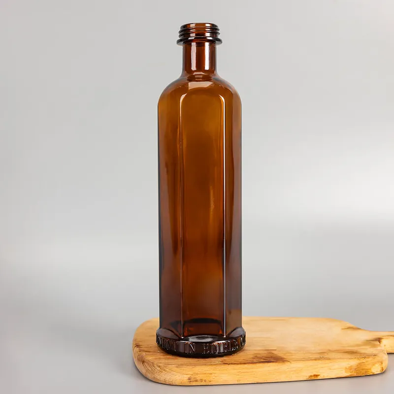 This hexagon shaped glass liquor bottle is made of amber glass material, which can prevent your spirits from uv-rays, keep them fresh for longer. This luxury glass liquor bottle is a customized bottle with a hexagonal shape and a unique logo embossed on the bottle. The bottom of the bottle also has an embossed design, which is not only a symbol of the brand's identity, but also provides a non-slip effect. It features a screw top finish, which matches screw caps. At HUIHE, we also provide caps, whatever the color or design, we can make it happen for you!