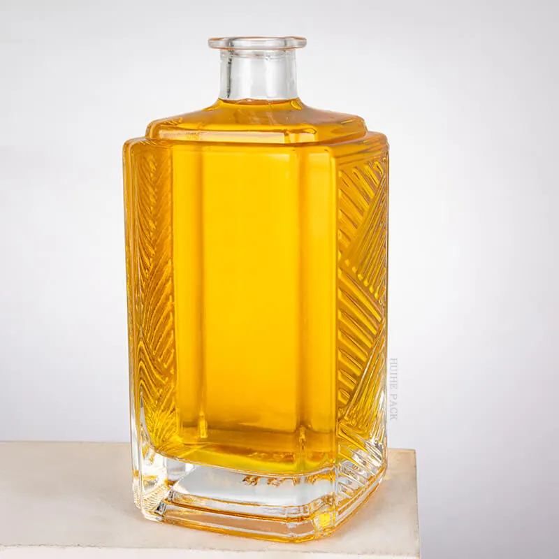 The bottle features subtle vertical ridges along the edges, adding texture and depth to its otherwise smooth surface. These ridges not only enhance the visual appeal but also provide a better grip. The neck is short and neatly integrated into the top of the rectangular body, maintaining the overall streamlined look. If you're in search of "stylish glass liquor bottles" to elevate your brand, this design is a perfect fit.